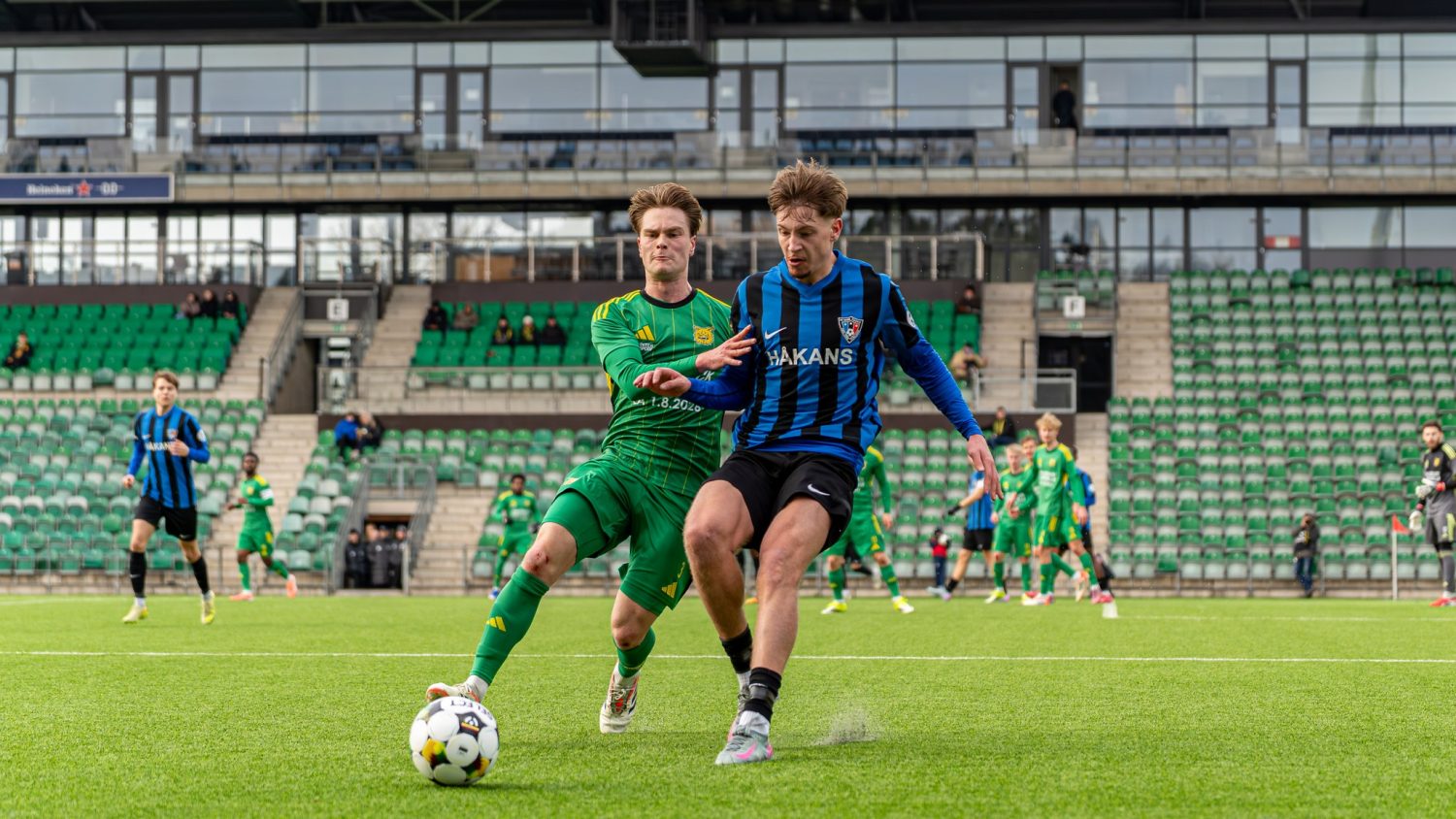 Toisessa päädyssä Jardell Kangan laukaus painui Inter-pelaajan kautta kulmapotkuksi, josta ei syntynyt tulosta. Tänään kapteeninnauhaa kantaneen Kangan seuraava laukaus 25 minuutin kohdalla vaati Eetu Huuhtaselta hyvän torjunnan etukulmasta.