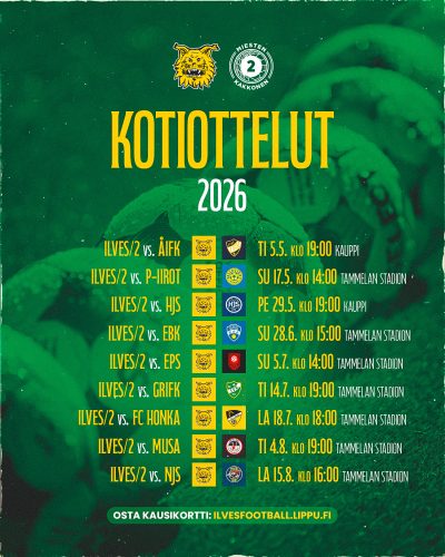 Ilves/2 aloittaa kautensa Miesten Kakkosessa huhtikuun 18. päivä EBK:n vieraana Espoossa. Ensimmäinen kotiottelu pelataan tiistaina 5.5. kello 19.00 Kaupissa – liput kaudelle 2026 myynnissä nyt! Sisäänpääsy otteluihin myös Ilveksen kausikortilla.